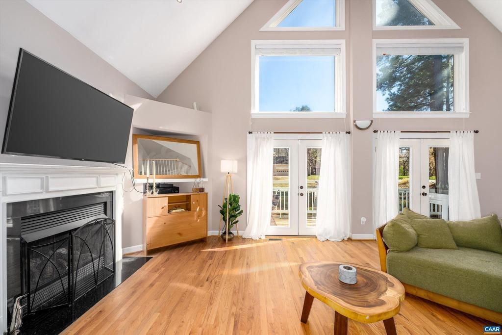 Tucked within the gated community of Lake Monticello just 20 minutes from Charlottesville, this delightfully charming A-frame home offers a perfect blend of character and comfort on a large, flat lot. The fully fenced backyard provides plenty of space for outdoor enjoyment and includes a storage shed and a graveled fire pit area while both a welcoming front porch and a private back porch invite you to relax and unwind. Inside, the main level features soaring vaulted ceilings in the living area, highlighted by expansive windows that flood the space with natural light and a cozy gas fireplace, all complemented by hardwood floors. The kitchen offers a unique peek-a-boo window that keeps you connected to the living space. The first floor is completed by a laundry room, full bathroom, and two bedrooms, one currently set up as an office with direct access to the back deck. Upstairs, the primary suite features a remodeled bathroom, multiple closets, and a charming Juliet balcony overlooking the side yard. With quick access to the Tufton and Turkeysag gates, as well as Beach 5, this home is ideally located with the Lake! Come see for yourself all that this inviting property has to offer.